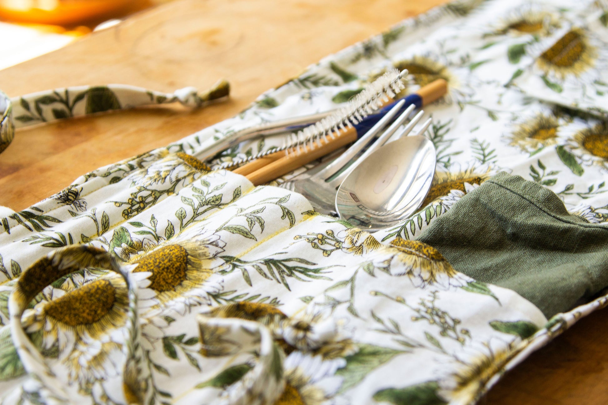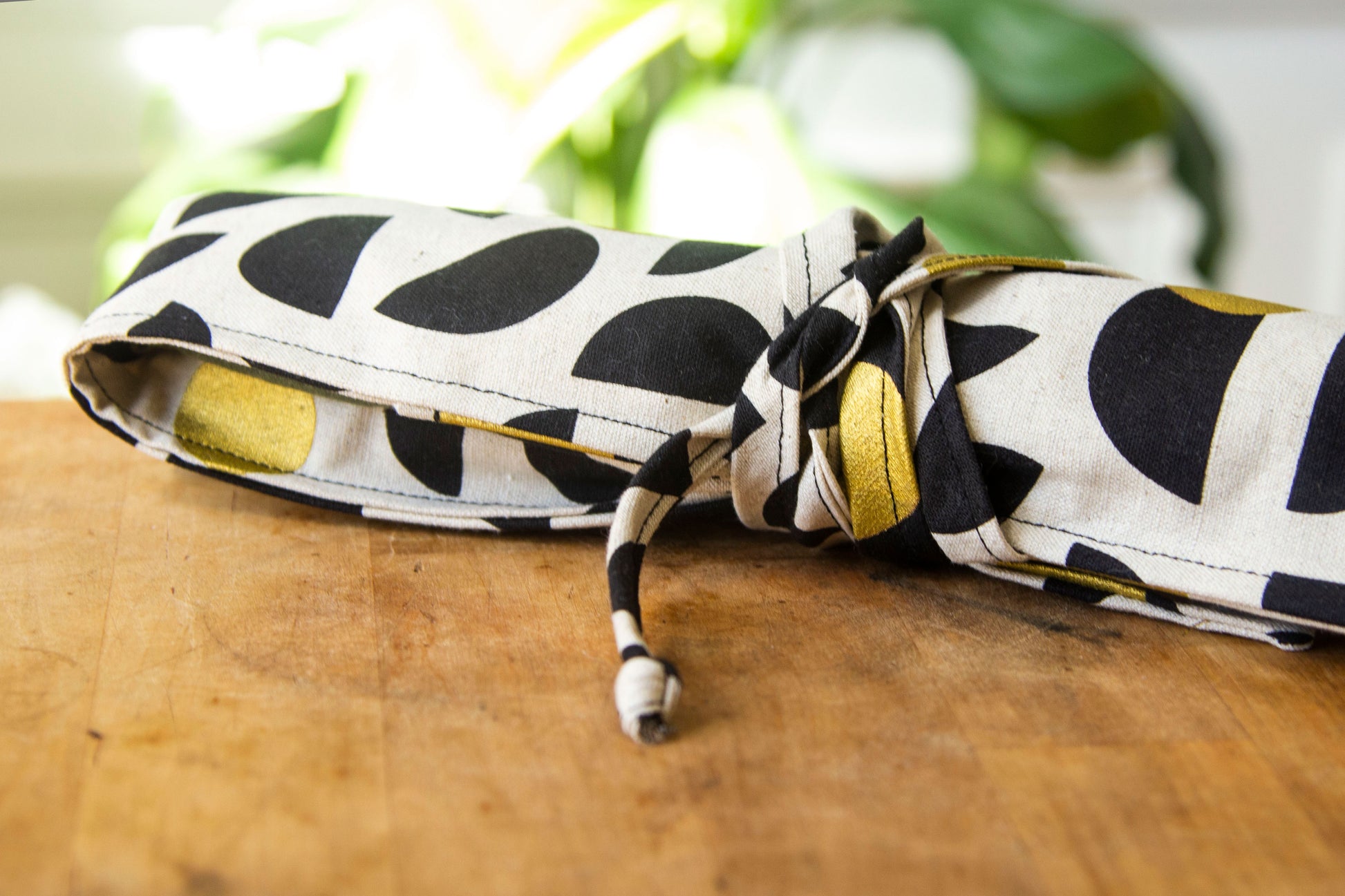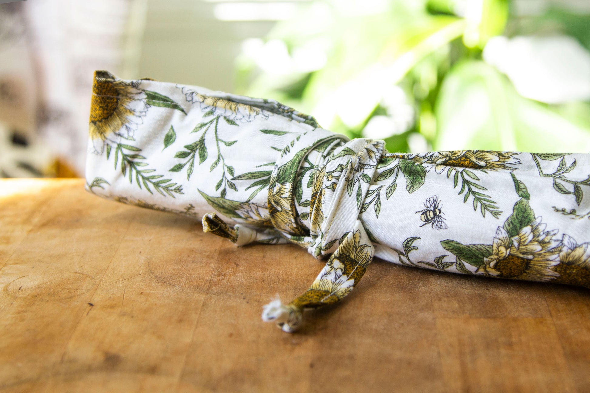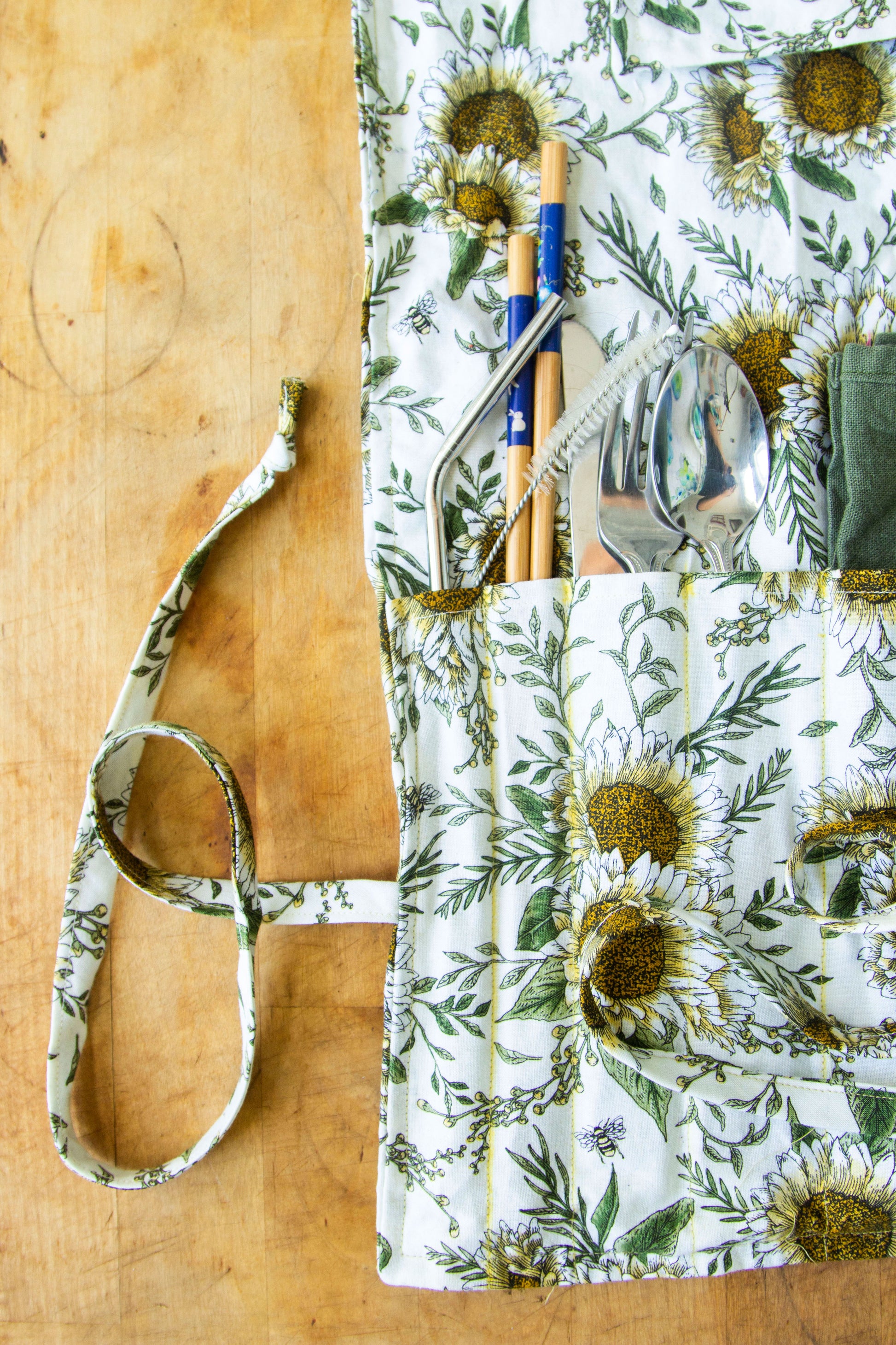 Any woven, non-stretch fabric will do! The pictured utensil rolls are made from a linen/cotton canvas (Black & Gold) and a quilters cotton (Sunflowers).