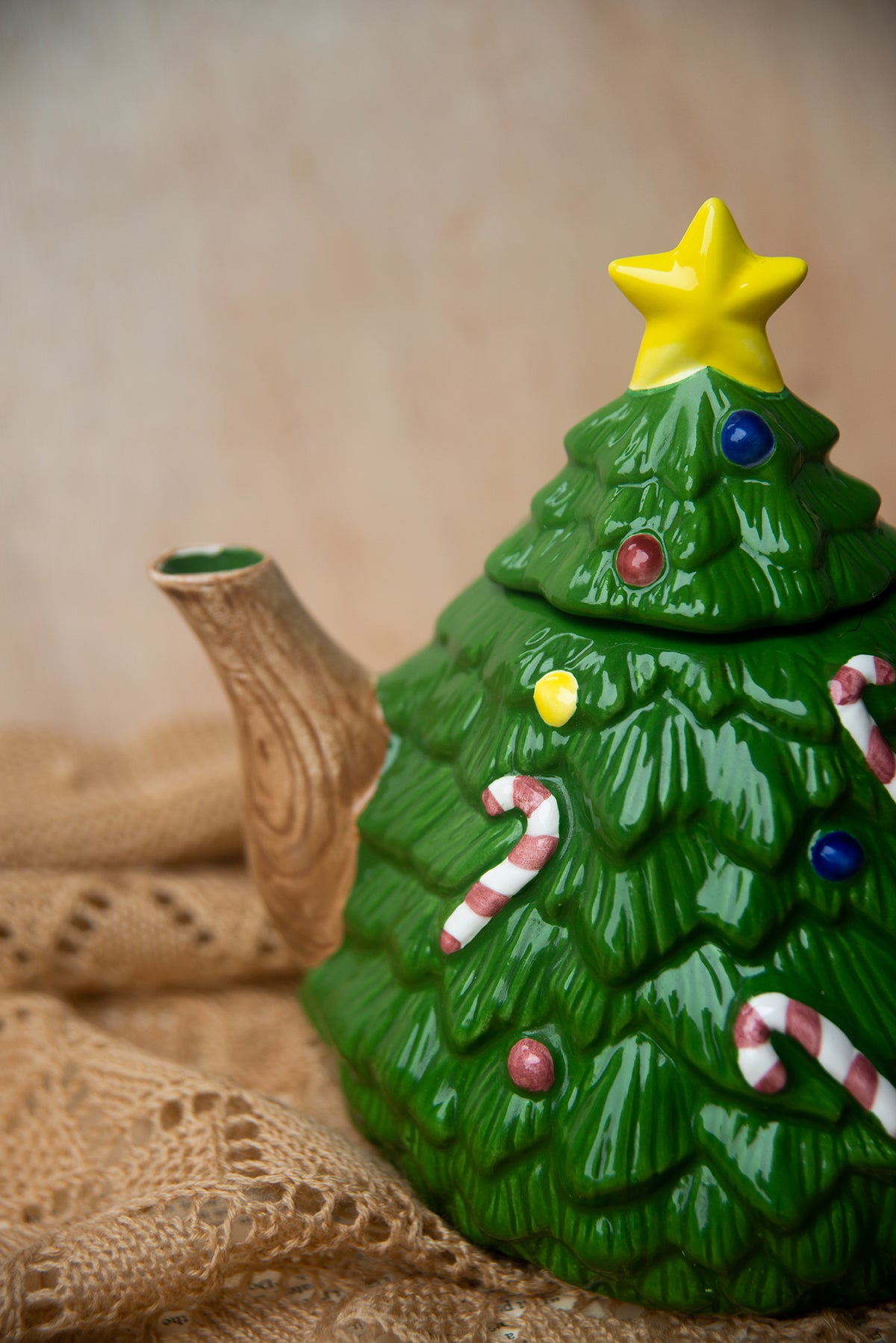 Enjoy holiday tea from this beautiful Christmas Tree teapot. Beautiful ornaments and candy canes decorate the tree complete with a shining star on top and a handle and spout fashioned like the trunk of the tree. A wonderful addition to the holiday table or as a festive decoration set around the home.