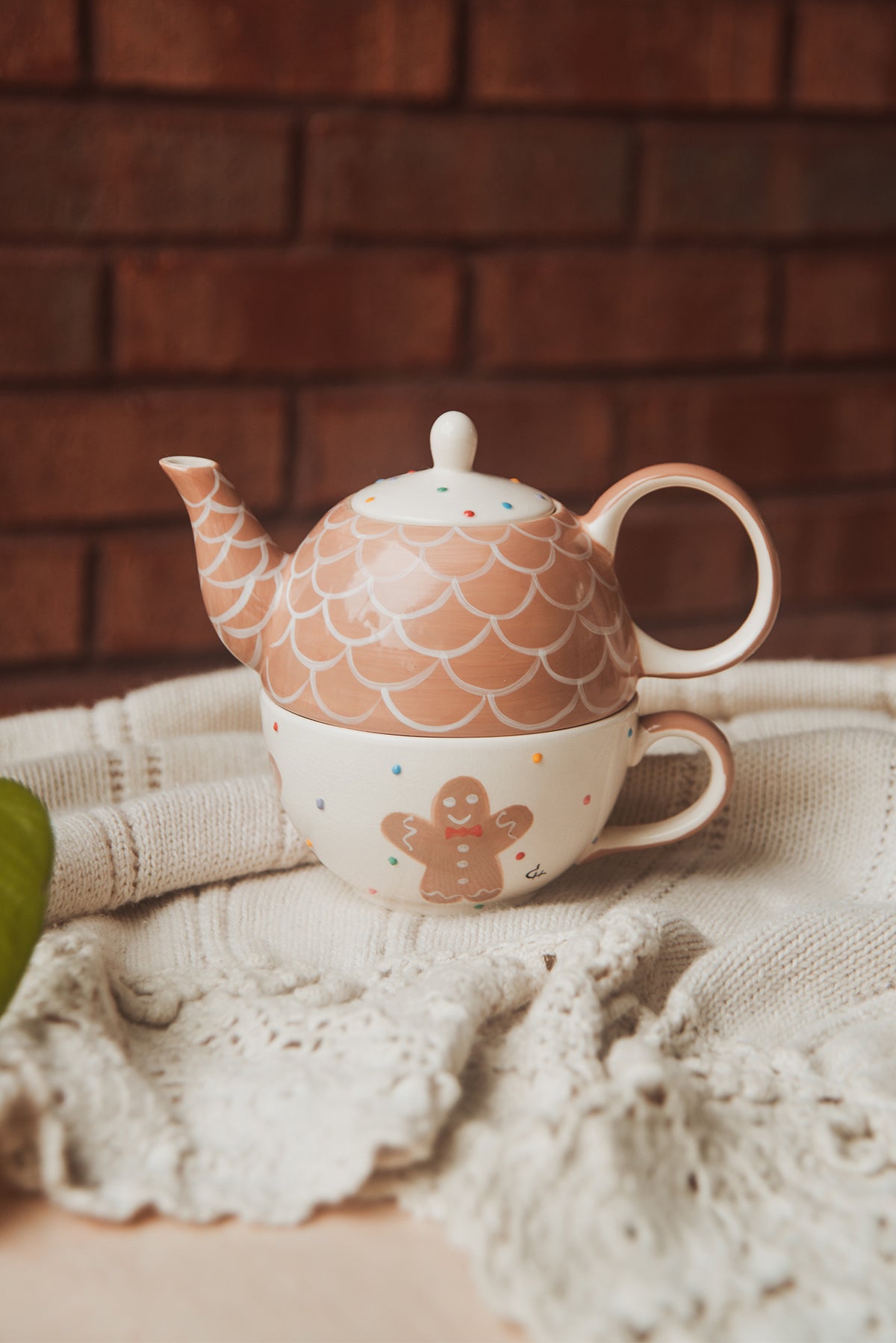 It's time to cozy on up for the holidays, and what better way than with this ultra-adorable, hand painted gingerbread tea set? The teapot itself resembles the roof of a gingerbread house while the cup is adorned with two gingerbread men and a sprinkling of colorful confetti for extra festive cheer!