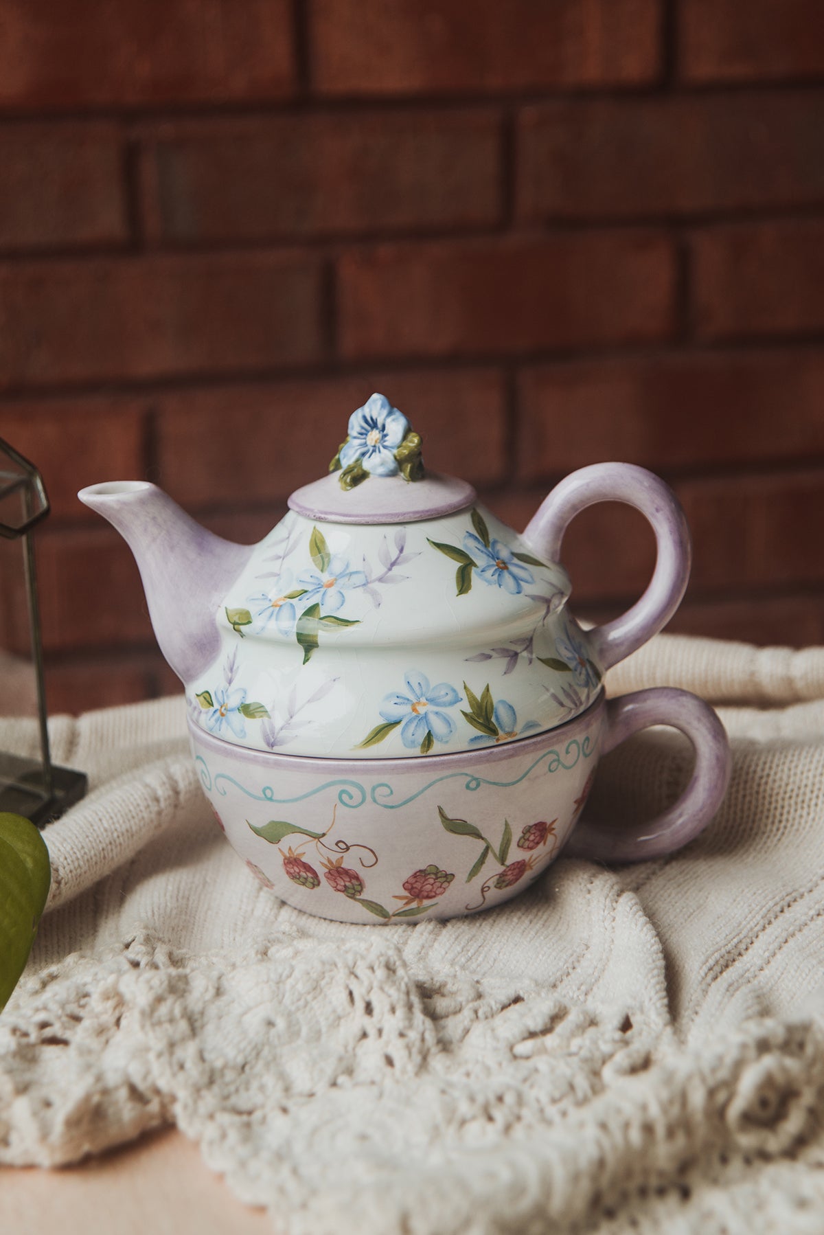 There is something so calming about the color purple, isn't there? Combine that with a delicate array of hand painted flowers and berries and you've got yourself the most lovely of teapot sets. And a set just wouldn't be complete without a matching blue flower to top it all off, would it?